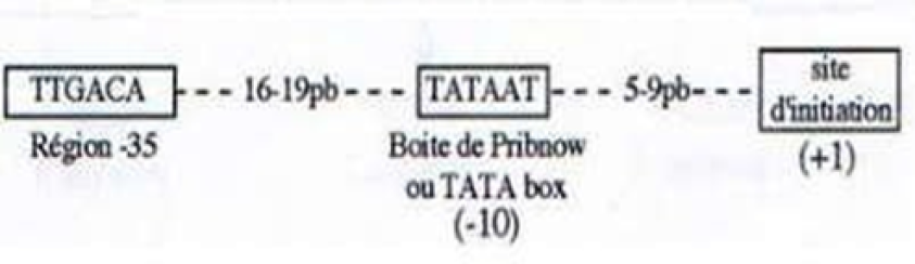 - Séquence « -35 » : est située approximativement à 35 paires de nucléotides en amont du point de départ de la transcription, représentée par 3 bases hautement conservées (supérieure à 75%). TTGACA (avec T82% T84% G78% A65% C54% A45%).