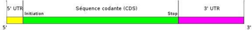 L'ARN polymérase commence sa progression sur le brin matrice dans le sens 5' vers 3'. Dans la plupart des cas une séquence dite 5'UTR (untranslated region) de taille variable est transcrite avant la séquence codante. De façon similaire, après la séquence codante, une séquence non codante appelée séquence de queue (trailer) ou 3' UTR est transcrite avant la fin de la transcription (fig. 37).