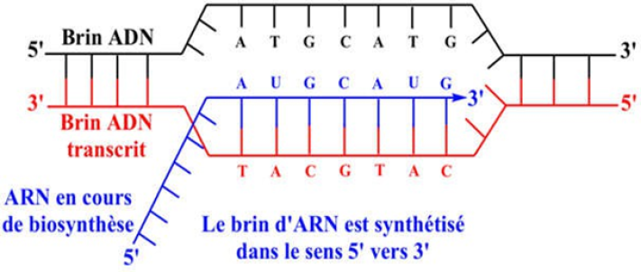 La synthèse d'un ARNm est toujours effectuée dans le sens conventionnel 5' – 3' et de façon antiparallèle et complémentaire par rapport au brin d'ADN transcrit.