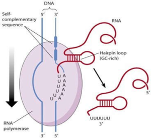 La transcription de la région à symétrie palindrome donnera donc une séquence d'ARNm capable de self-complémentarité, l'ARNm se terminera par une boucle. C'est cette boucle en épingle à cheveux qui serait responsable de l'arrêt de la transcription.